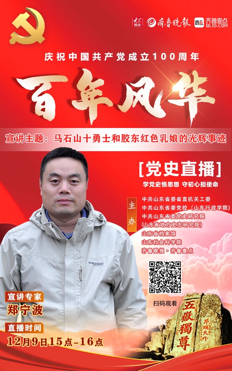 海报|郑宁波:《马石山十勇士和胶东红色乳娘的光辉事迹》 党建亮点 2021-12-08 1116 学党史悟思想,守初心担使命。中共山东省委省直机关工委、中共山东省委党校、中共山东省委党史研究院(山东省地方史志研究院)、山东省档案馆、山东社会科学院与齐鲁晚报·齐鲁壹点联合主办《“百年风华”党史直播》。第21期直播嘉宾郑宁波:《马石山十勇士和胶东红色乳娘的光辉事迹》 责任编辑:李和晴