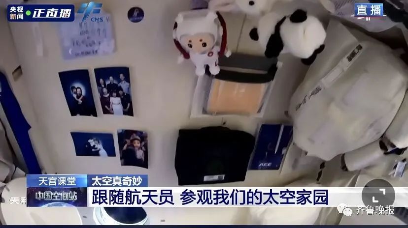 在王亚平的睡眠区里贴着她跟家人的照片,还有带上太空的小玩偶。