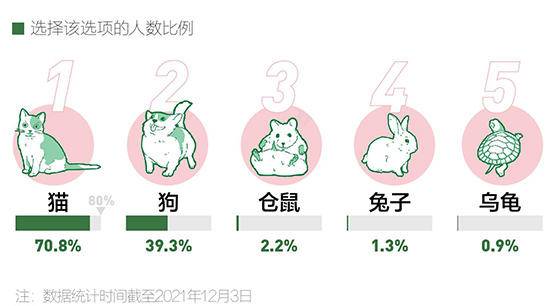 有媒体调查表明,年轻人养宠物已达到六成,在受访者养的所有宠物中,有超过7成人养了猫,接近4成人养了狗。其次是仓鼠、兔子和乌龟。类似蜘蛛、蜥蜴、蛇等小众异宠也有出现,但数量很少。