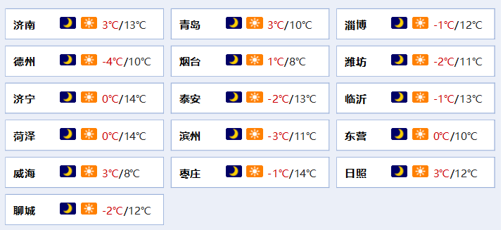 全省天气晴间多云。半岛地区北风转南风3~4级,其他地区南风3~4级短时北风2~3级。 最低气温:鲁西北和半岛内陆地区-3℃左右,沿海地区2℃左右,其他地区-1℃左右。