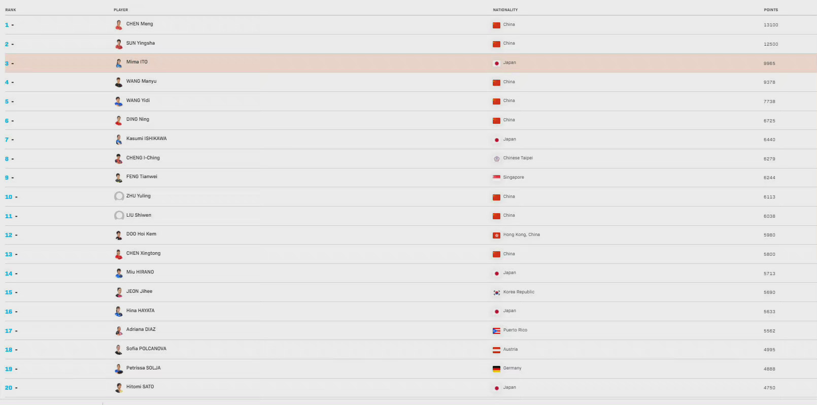 国际乒联公布年终排名:樊振东、陈梦均世界第一 人民日报 2021-12-22 12月21日,国际乒联公布年终世界排名。本期排名与上周相比没有变化,樊振东和陈梦分别排名男女单打首位。男单前五:樊振东、马龙、许昕 、雨果·卡尔德拉诺 、张本智和。女单前五:陈梦、孙颖莎 、伊藤美诚、王曼昱 、王艺迪。 【如果您有新闻线索,欢迎向我们报料,一经采纳有费用酬谢。报料微信关注:ihxdsb,报料QQ:3386405712】