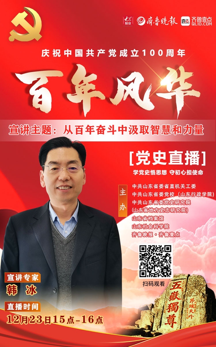 海报|韩冰:从百年奋斗中汲取智慧和力量 云端党课 2021-12-23 1791 学党史悟思想,守初心担使命。中共山东省委省直机关工委、中共山东省委党校、中共山东省委党史研究院(山东省地方史志研究院)、山东省档案馆、山东社会科学院与齐鲁晚报·齐鲁壹点联合主办《“百年风华”党史直播》。第22期直播嘉宾韩冰:从百年奋斗中汲取智慧和力量 责任编辑:李和晴