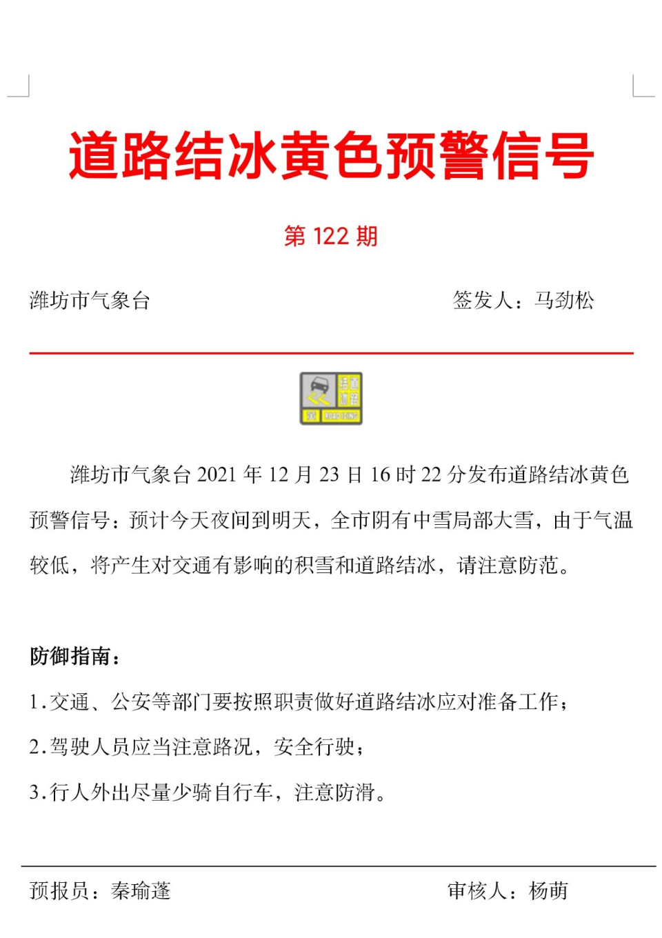 23日夜间到24日有中到大雪,出行注意警惕道路结冰防滑 大众报业·齐鲁壹点 2021-12-24 1082 齐鲁晚报·齐鲁壹点记者 李旭旭 2021年12月23日16时22分,潍坊市气象台发布道路结冰黄色预警信号:预计23日夜间到明天,全市阴有中雪局部大雪,由于气温较低,将产生对交通有影响的积雪和道路结冰,请注意防范。 对比,潍坊市气象台发布防御指南:交通、公安等部门要按照职责做好道路结冰应对准备工作;驾驶人员应当注意路况,安全行驶;行人外出尽量少骑自行车,注意防滑。 责任编辑:张焜