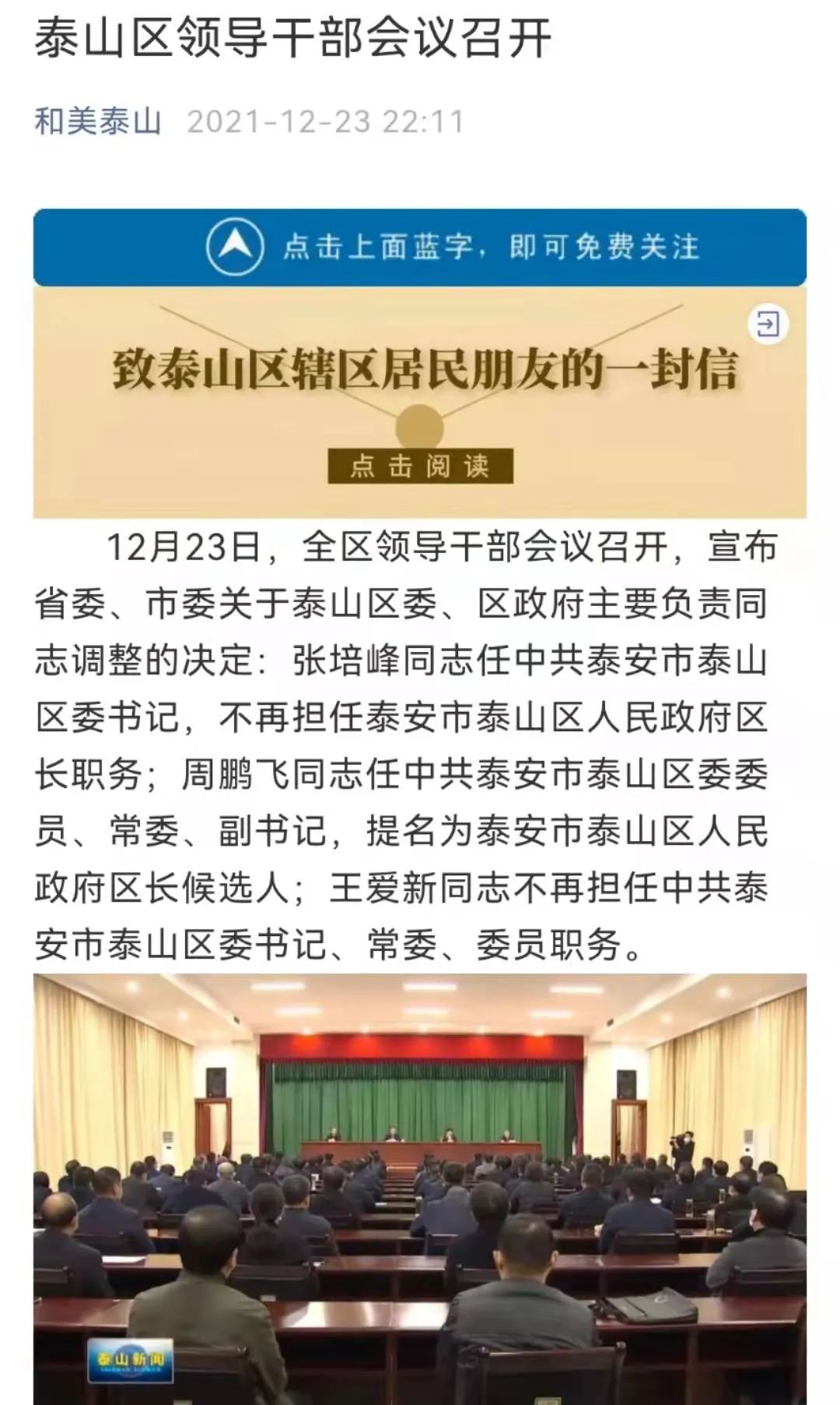 12月23日,泰山区领导干部会议召开,宣布省委、市委关于泰山区委、区政府主要负责同志调整的决定:张培峰同志任中共泰安市泰山区委书记,不再担任泰安市泰山区人民政府区长职务;周鹏飞同志任中共泰安市泰山区委委员、常委、副书记,提名为泰安市泰山区人民政府区长候选人;王爱新同志不再担任中共泰安市泰山区委书记、常委、委员职务。