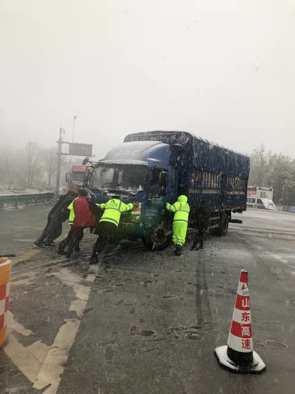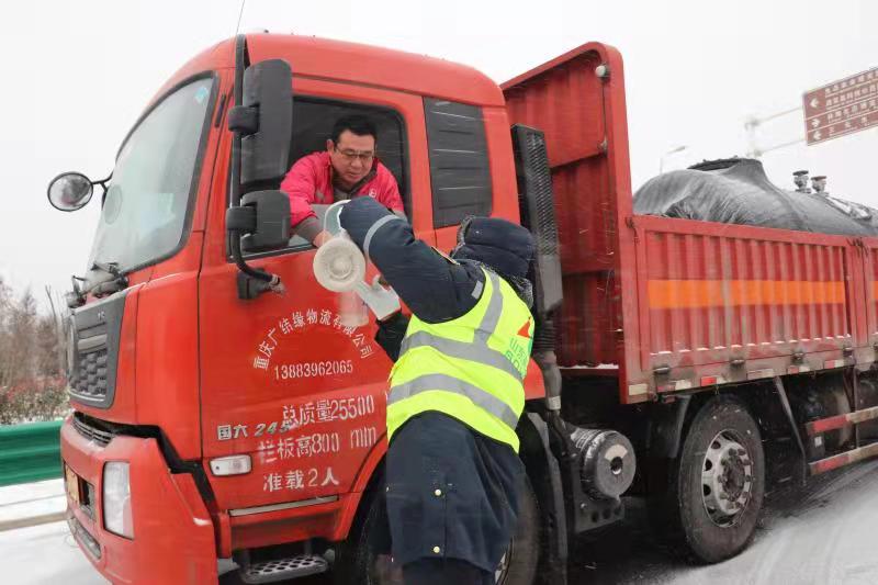 雪天高速公路收费员送温暖
