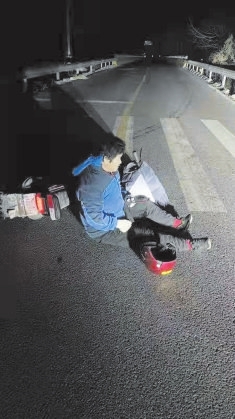 20点46分左右,当他行驶到青岛市黄岛区胜水河大桥北侧弯道的时候,突然发现前方有一名中年妇女瘫倒在道路中间——— 头盔、电动自行车都摔在了马路中间,人瘫坐在地上。