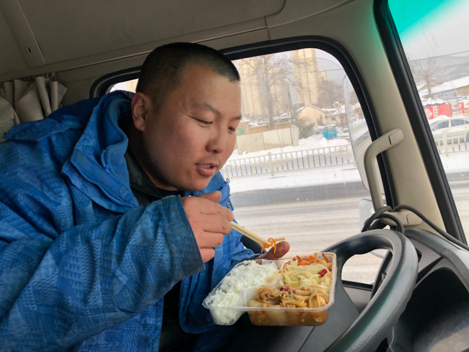 驾驶室里的盒饭也凉了。“饿过劲了,没有食欲,这是我的早饭。”下午3点多,陈磊吃了几口盒饭便放在一旁。中控台边放着一袋子鸡蛋,是24日中午他媳妇送过来的。