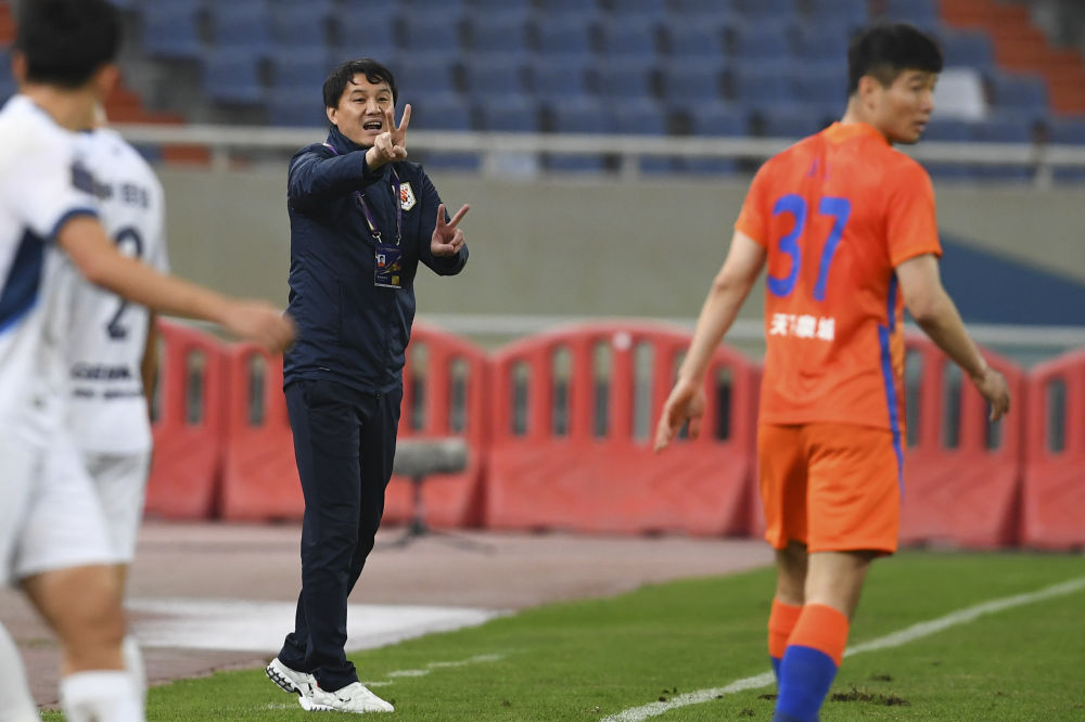 山东泰山队主教练郝伟(中)在比赛中指挥。新华社记者 朱峥 摄