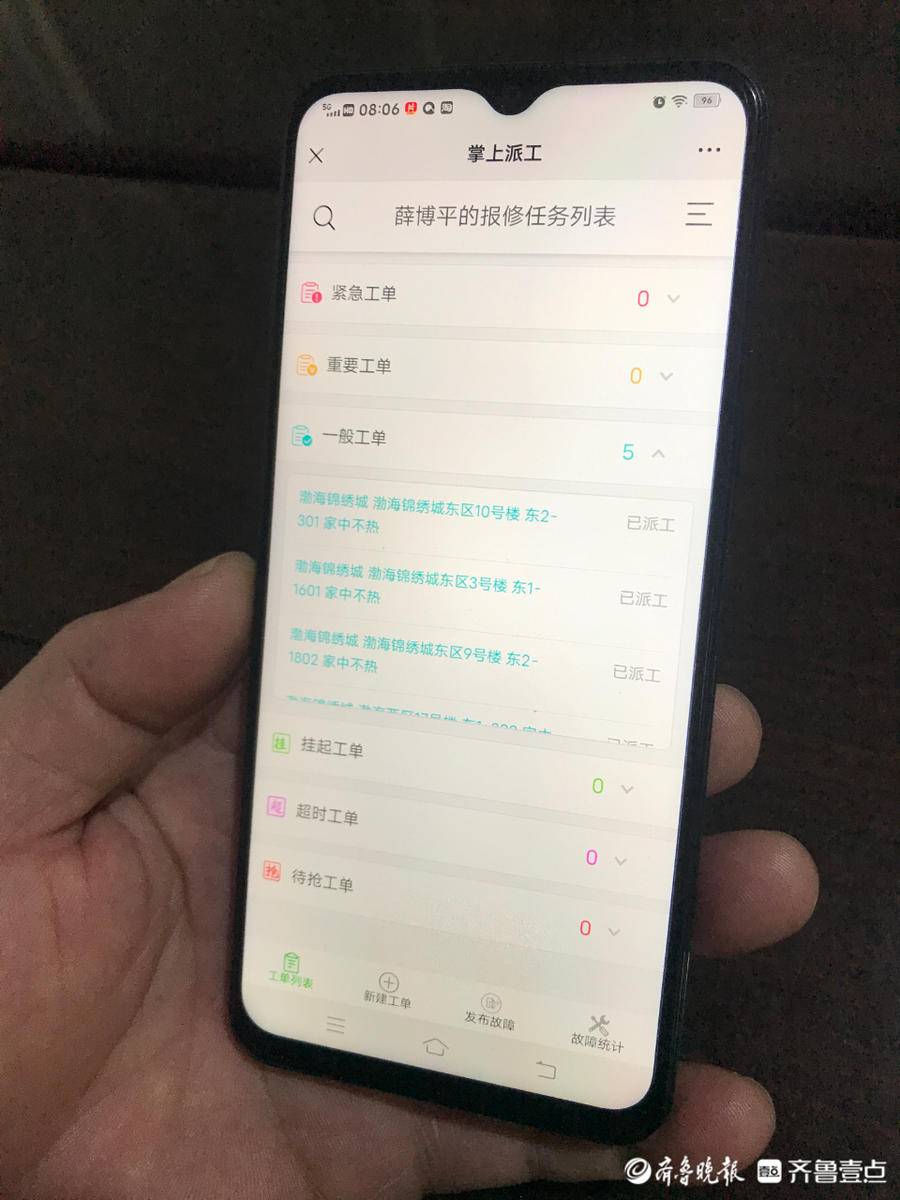 在博兴县通源热力公司负责范围内有5个所队,每个所队分片管理,各负其责,而薛博平便是王楼所队的所长。通过公司“掌上派单”系统,只要系统内录入了市民电话,一旦接到相应手机号,系统会自动显示市民的小区位置,离着近的所队则会上门维修,入户维检修便是薛博平每天的工作之一。