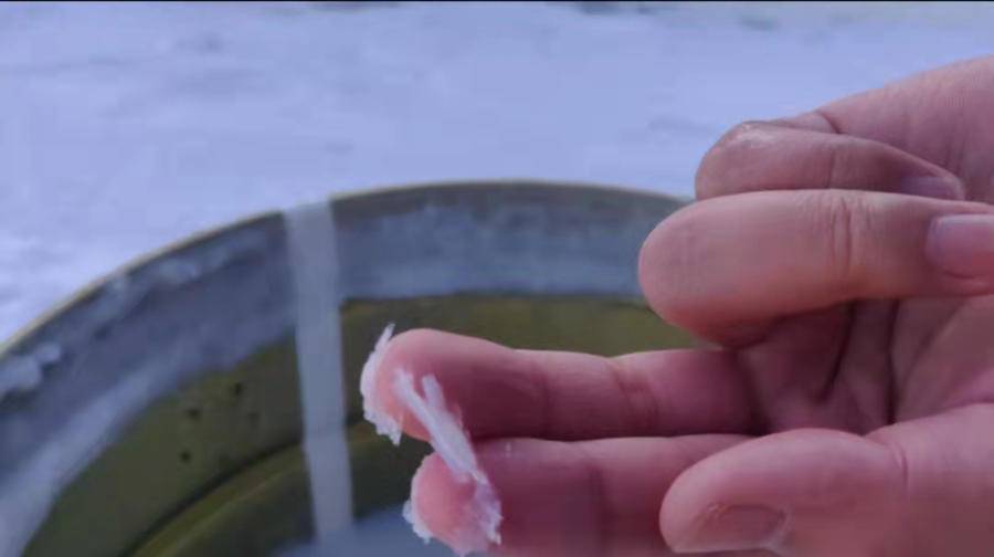 此时漆桶里的边缘部分已经结冰,用手在桶边刮一刮,面漆已经成为了白色的冰晶状物体,看起来像雪。