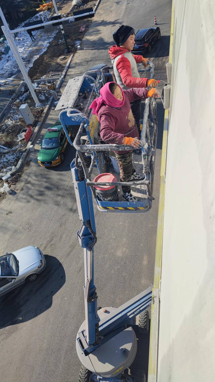 一部分人站在路面上刷内墙,还有一部分人站在路外,被升降机托举到20米高的高处,涂刷外墙。