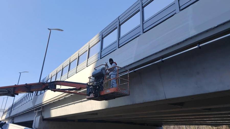 从桥面上向下看去,20多米的高度让人不寒而栗,两位工人站在升降机上,面不改色地工作。刷漆听起来很简单,但实际上并不如此,正在升降台上的工作人员李先生说:“刷漆的时候,尽量不要往下掉,因为会污染路面;刷的时候需要均匀涂刷,注意下面拍花的花纹;均匀的话可以上漆,不均匀的话漆不能上。”