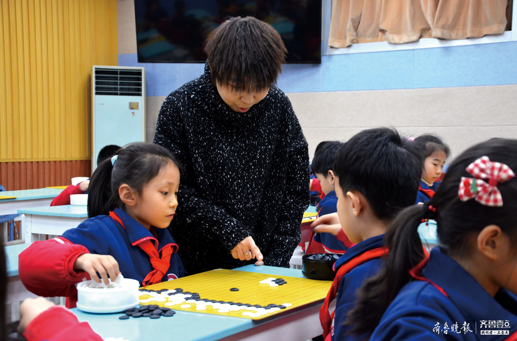 在围棋社团的活动教室内,30多名小学生两两相对而坐,思索、落子、布局,孩子们的动作有板有眼。指导教师何常红在孩子们中间认真观察,并不时对他们进行专业指导。随后,何常红针对当堂课中孩子们遇到的问题进行系统讲解。“下围棋让我养成了多思考、沉着冷静的好习惯。”学生张振浩告诉齐鲁晚报·齐鲁壹点记者,他学习下围棋已经两个多月的时间,不知不觉中已经深深喜欢上了围棋。