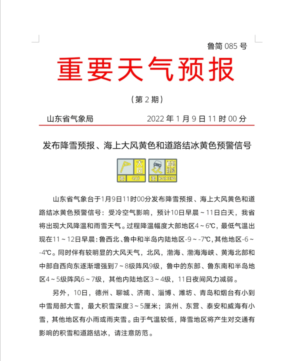 11时,山东省气象台发布降雪预报、海上大风黄色和道路结冰黄色预警信号:受冷空气影响,预计10日早晨~11日白天,我省将出现大风降温和雨雪天气。