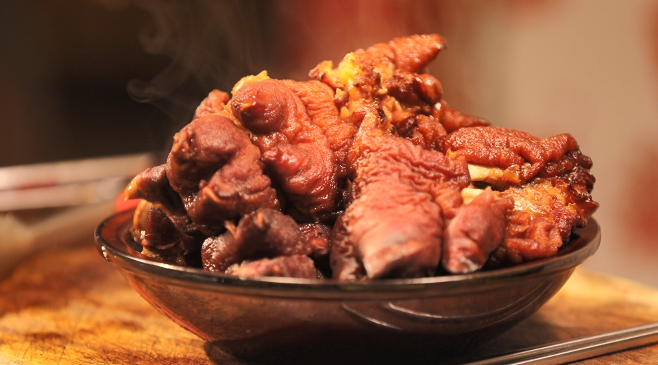 一抹异香从锅中传出,开锅一看,原来有猪蹄在鸡锅里。家里人即刻将猪蹄捞出,用筷子一夹软糯脱骨,一尝味道惊喜不已。因猪蹄是按照扒鸡的技艺做法制成,从此该产品被命名为“扒蹄”。