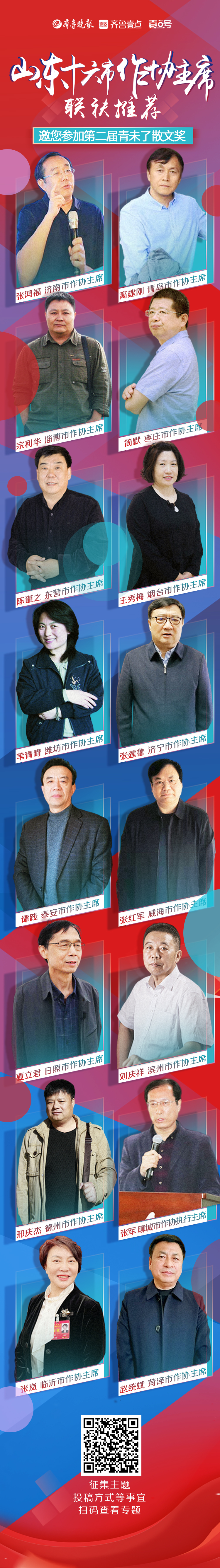 长图壹站丨第二届青未了散文奖启动,山东16市作协主席联袂推荐 长图壹站 2022-01-24 2447 齐鲁晚报·齐鲁壹点记者 孙远明 设计 许晨 第二届青未了散文奖日前启动,山东16市作协主席分别发来寄语、视频,联袂推荐、诚邀各界作家、散文爱好者投稿参加。 责任编辑:孙远明