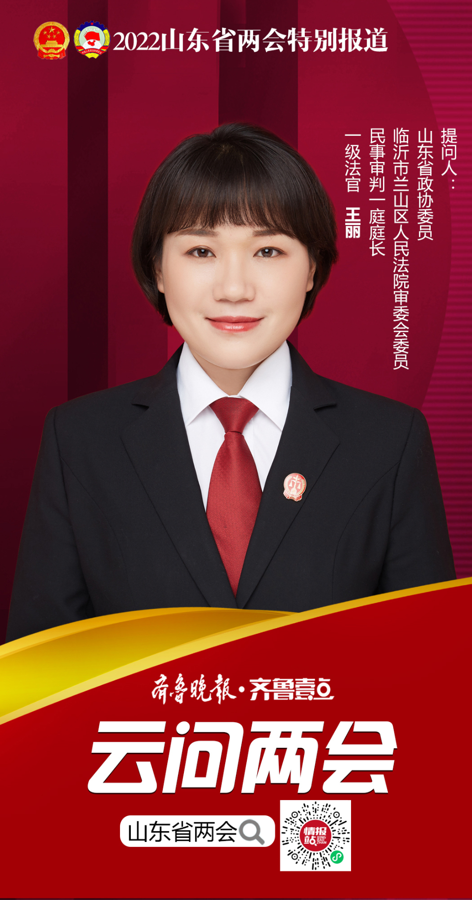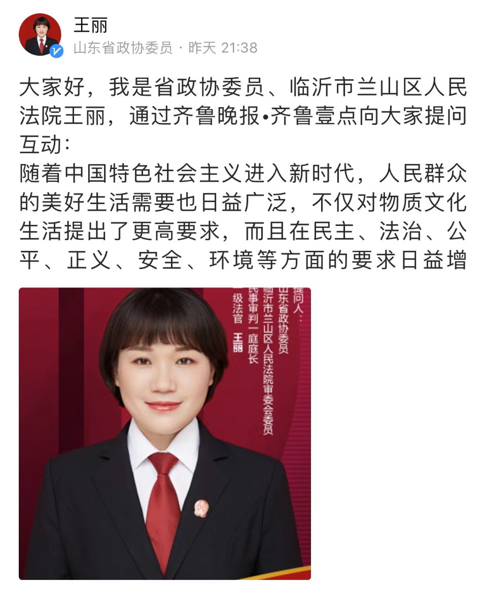 山东省政协委员、临沂市兰山区人民法院王丽提问互动:大家好,我是省政协委员、临沂市兰山区人民法院王丽,随着中国特色社会主义进入新时代,人民群众的美好生活需要也日益广泛,不仅对物质文化生活提出了更高要求,而且在民主、法治、公平、正义、安全、环境等方面的要求日益增长。为不断满足人民群众多元化司法需求,各地法院都在不断地创新司法为民举措,比如一站式诉讼服务中心建设及网上立案、跨域立案、诉调对接等工作的开展,目的都是为了不断提高司法供给能力和服务能力,增强人民群众的司法获得感和幸福感。 什么样的司法服务是大家真正需要的?什么样的举措是真正便民利民的?大家都有哪些好建议?欢迎与我互动分享。