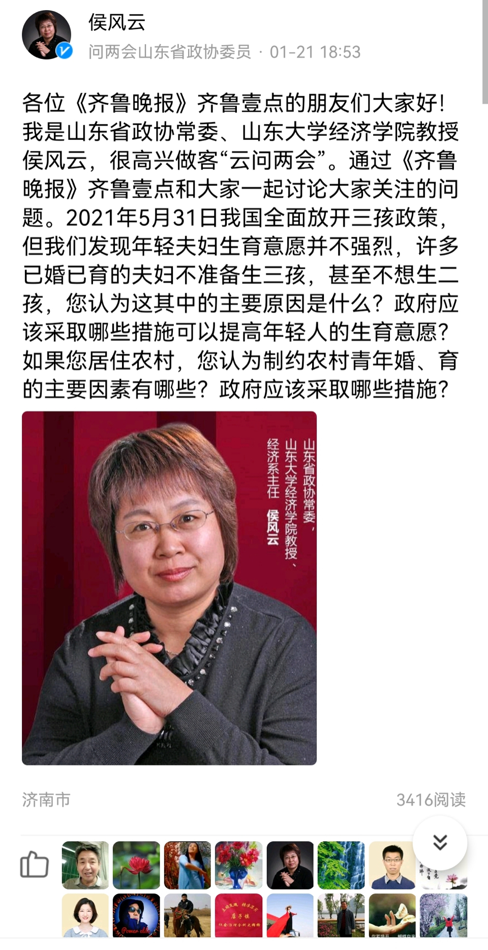 1月22日,情报员“自由人”通过齐鲁晚报官方客户端齐鲁壹点情报站与山东省政协常委、山东大学经济学院教授侯风云在线互动,聊一聊有关年轻夫妇生育意愿不强烈,如何提高年轻人的生育意愿等问题进行交流。