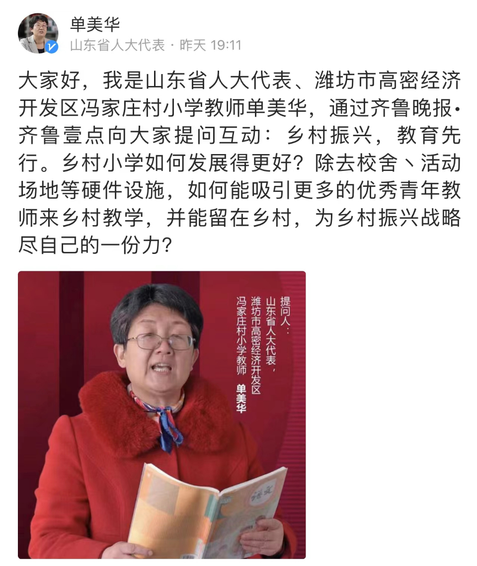 1月24日活动第三天,山东省人大代表、潍坊市高密经济开发区冯家庄村小学教师单美华,和大家聊一聊:乡村小学如何发展得更好?除去校舍丶活动场地等硬件设施,如何能吸引更多的优秀青年教师来乡村教学,并能留在乡村,为乡村振兴战略尽自己的一份力?欢迎大家通过情报站与她在线畅谈。