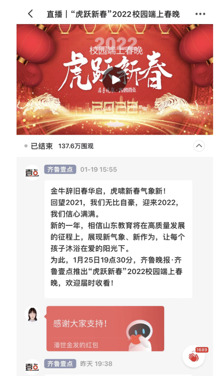 “节目精彩,太好看了!”2022年春节即将来临,为展示中小学师生风采,更好的体现学校艺术教育,1月25日(农历小年)19点30分,齐鲁晚报·齐鲁壹点推出“虎跃新春”2022年校园端上春晚,齐鲁晚报视频号、官方微博、新浪、百度、头条等平台进行同步直播。截至目前,各平台观看量总计130余万次,四千余人留言点赞。