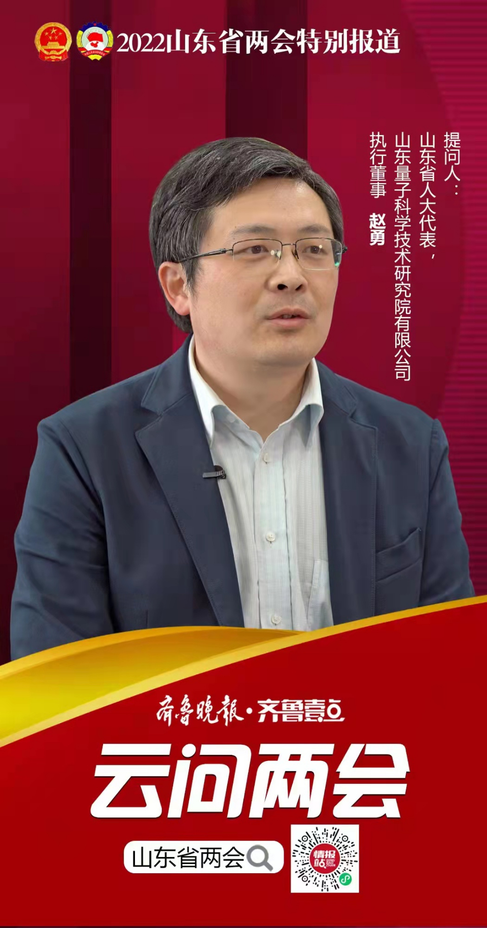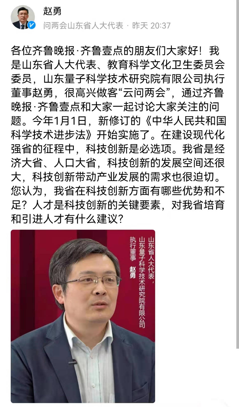 山东省人大代表、教育科学文化卫生委员会委员,山东量子科学技术研究院有限公司执行董事赵勇提问互动:各位齐鲁晚报·齐鲁壹点的朋友们大家好!我是山东省人大代表、教育科学文化卫生委员会委员,山东量子科学技术研究院有限公司执行董事赵勇,很高兴做客“云问两会”,通过齐鲁晚报·齐鲁壹点和大家一起讨论大家关注的问题。今年1月1日,新修订的《中华人民共和国科学技术进步法》开始实施了。在建设现代化强省的征程中,科技创新是必选项。我省是经济大省、人口大省,科技创新的发展空间还很大,科技创新带动产业发展的需求也很迫切。您认为,我省在科技创新方面有哪些优势和不足?人才是科技创新的关键要素,对我省培育和引进人才有什么建议?