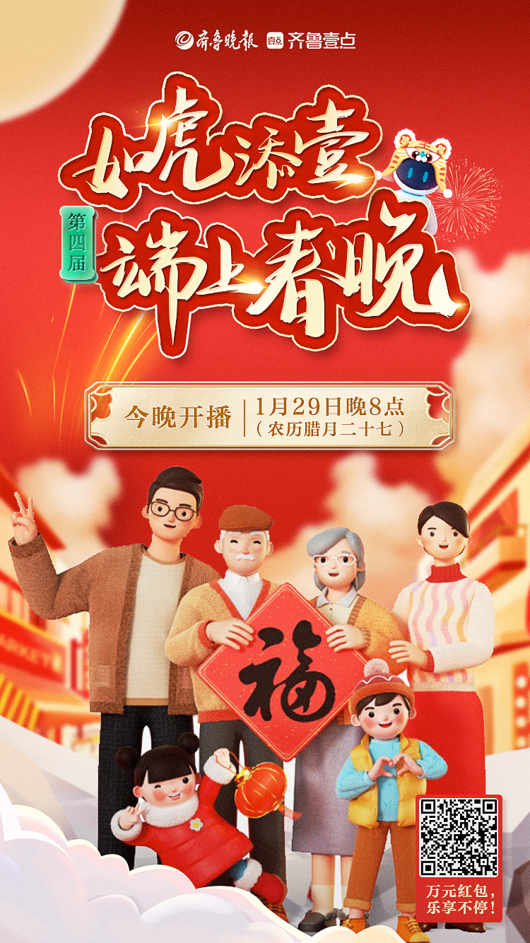 1月29日晚八点,在齐鲁壹点准时收看2022“端上春晚”,在评论区互动留言后“摇一摇”,就可以抢现金红包啦!抢红包活动将持续到2022年2月1日(大年初一)24时,机不可失,快来围观今年的端上春晚,参与互动,瓜分万元现金红包大奖吧!