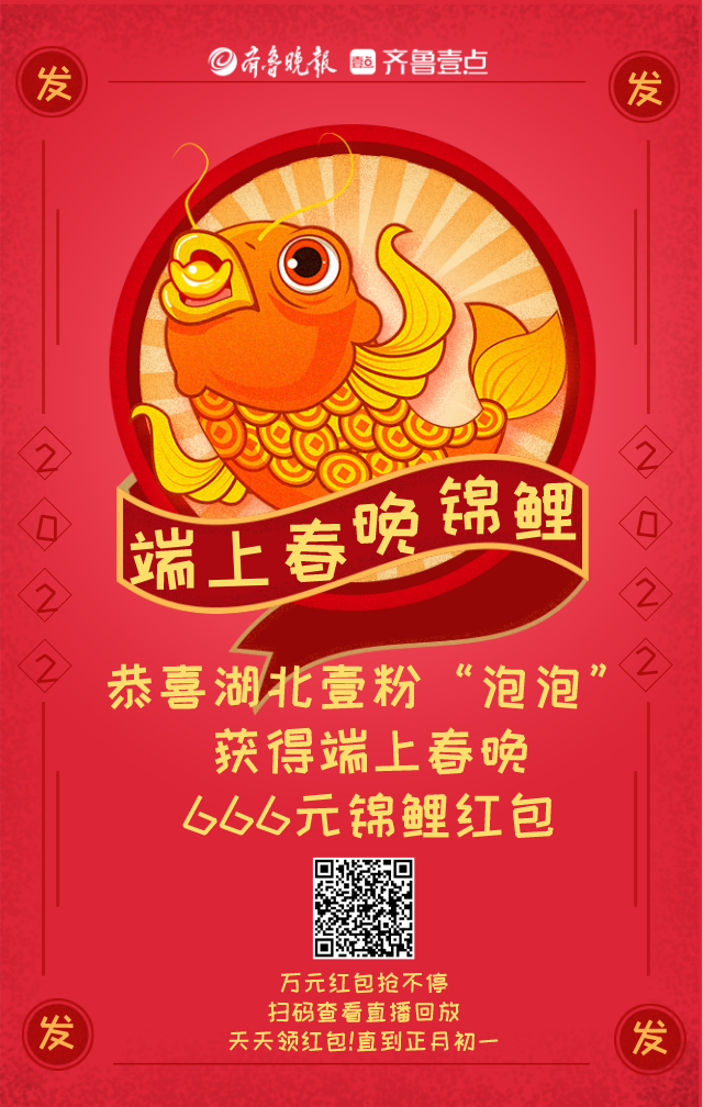 1月29日晚8点46分03秒,湖北黄冈壹粉“泡泡”在观看并参与“端上春晚”的直播互动中,摇到666元大红包,成为2022年齐鲁晚报·齐鲁壹点“端上春晚”的锦鲤大奖获得者,恭喜!