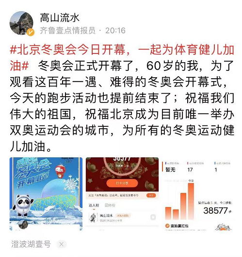 济南壹粉“高山流水”:冬奥会正式开幕了,60岁的我,为了观看这难得的冬奥会开幕式,今天的跑步活动也提前结束了;祝福我们伟大的祖国,祝福北京将成为目前唯一举办双奥运动会的城市,为所有的冬奥运动健儿加油。