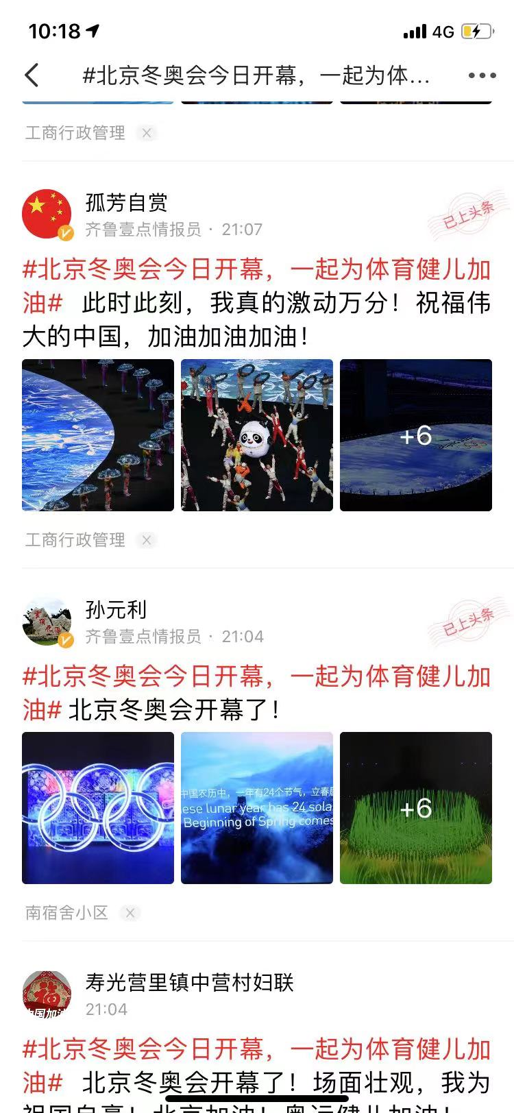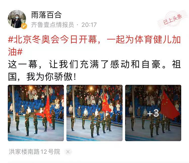 2月4日晚,在齐鲁晚报·齐鲁壹点情报站,壹粉纷纷刷屏点赞北京冬奥会开幕式:“在如此重要的场合,看到如此惊艳的开幕式,心都激动地在颤抖!这一刻,如此骄傲。”