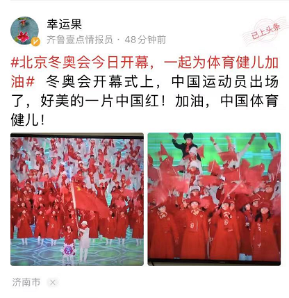 济南情报员“幸运果”:冬奥会开幕式上,中国运动员出场了,好美的一片中国红!加油,中国体育健儿!