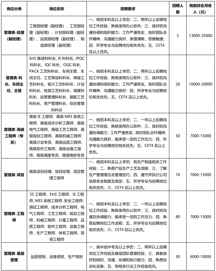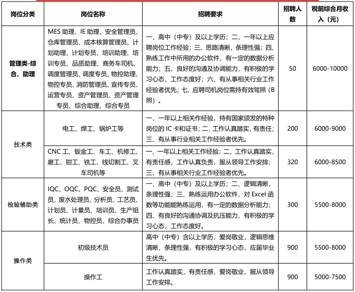 关于招聘岗位待遇和要求,比亚迪济南工厂负责人向齐鲁晚报·齐鲁壹点记者介绍,现阶段主要招聘操作类初级技术员和普工。工作每月休息约4天。公司提供食宿,宿舍6至8人一间。初级技术人员岗位要求高中(中专)含以上学历,爱岗敬业,有较强的学习能力,应届毕业生优先,工资在6000元/月至9000元/月之间。普工岗位要求没有学历和工作经验的要求,要求工作认真踏实,爱岗敬业、服从安排即可,工资在5500元/月至6000元/月之间。其他管理类岗位,要求相应的工作经验和资格证书等要求,具体见招聘文末信息表。