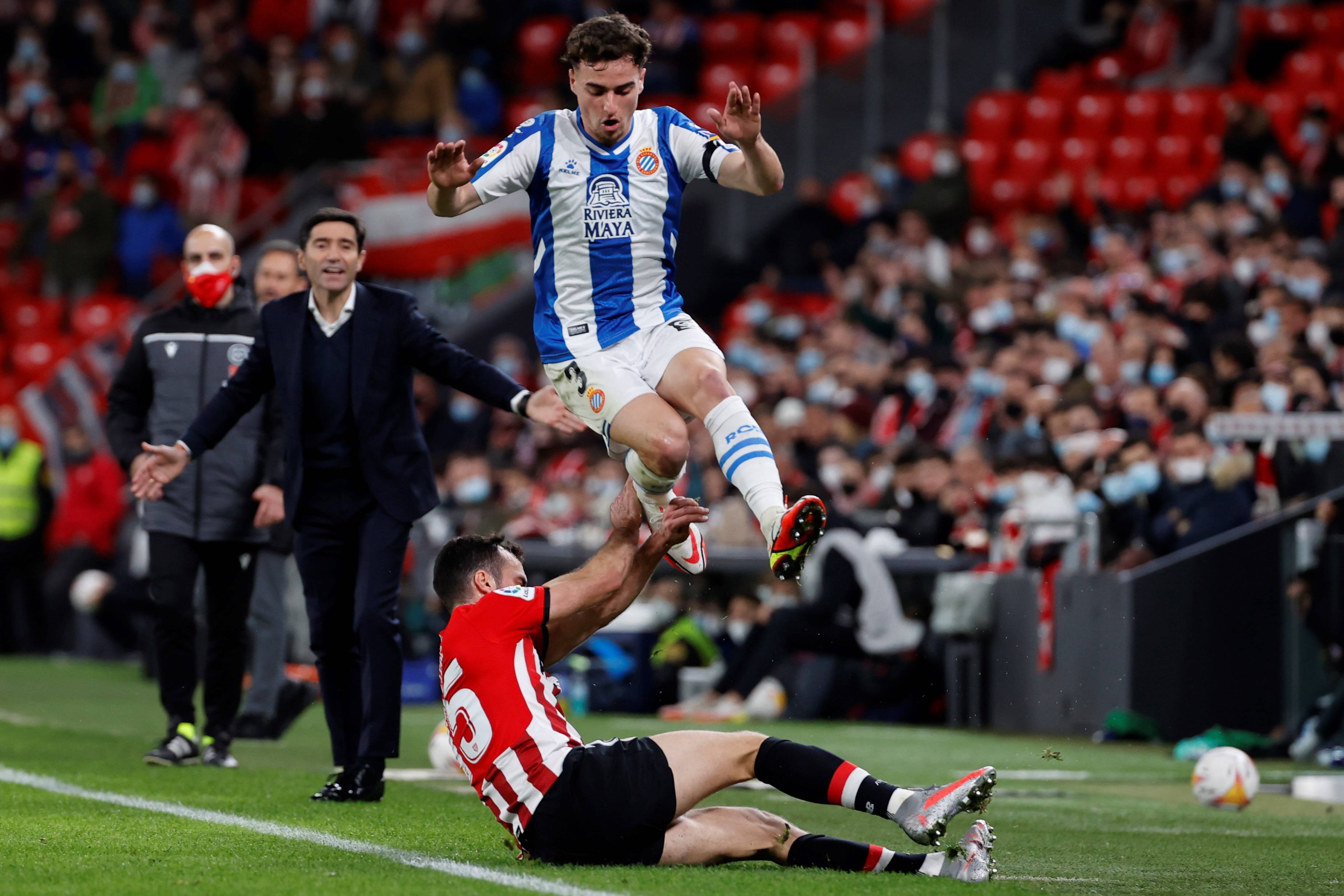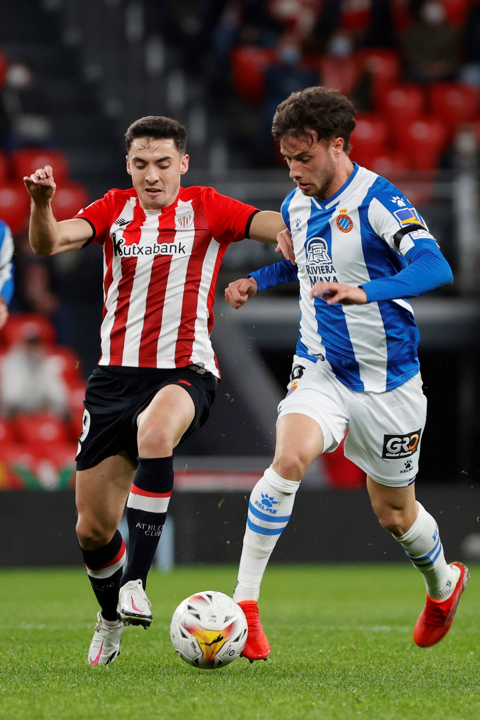 2月7日,毕尔巴鄂竞技队球员桑切特(左)与西班牙人队球员卡布雷拉拼抢。