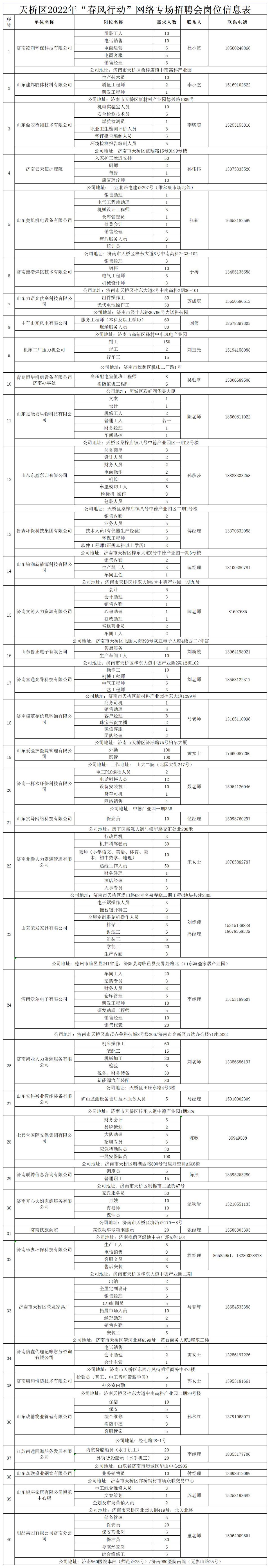 新春伊始,为保障企业尽快复工复产,求职者返岗,天桥区人社局举办“春风送温暖、就业送真情”为主题的春风行动网络招聘会,此次招聘会共有40家企业,提供1837个岗位。广大用工单位和求职者可通过以下渠道免费发布、获取招聘信息。