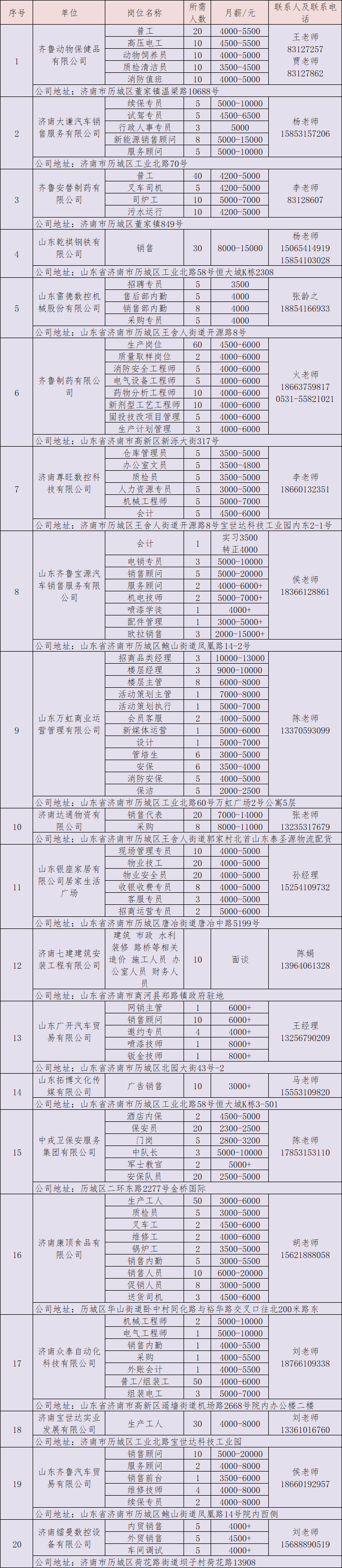 为帮助返乡人员、未就业高校毕业生等各类重点群体尽快实现就业,满足企业用工需求,充分发挥人力资源社会保障部门保用工促就业作用,积极搭建供需对接平台,推动实现更充分更高质量就业。由历城区人社局主办,王舍人街道承办的线上招聘会,邀请20家企业参与招聘,提供784个就业岗位,招聘信息详情如下: