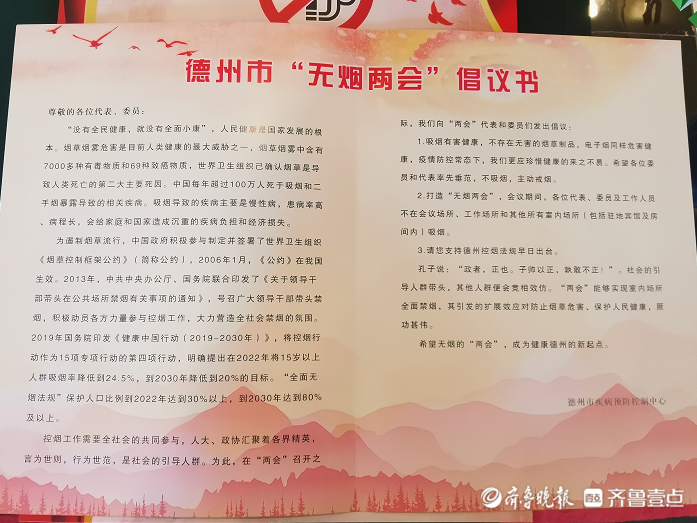 值得一提的是,此次两会倡导无烟环境,德州市疾病预防控制中心的工作人员为委员们发放了德州市“无烟两会”倡议书、印有“无烟德州”的口罩等物品。