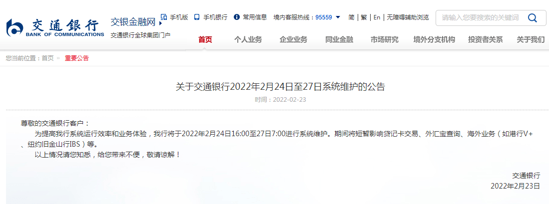 2月23日,中国交通银行发布关于2022年2月24日至27日系统维护的公告