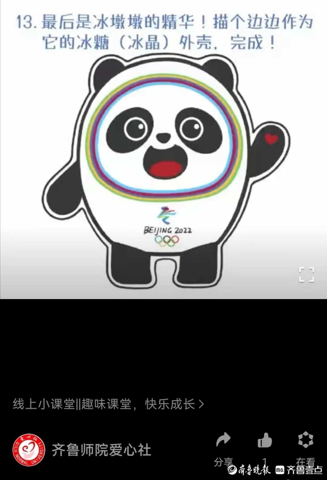 除此之外,2022年北京冬奥会的吉祥物“冰墩墩”也被志愿者们请来啦。大学生志愿者在视频中耐心给孩子们讲解冰墩墩的文化特色,它象征着纯洁、坚强,是冬奥会的特点,只见志愿者用手中的彩笔一气呵成,一只可爱的冰墩墩就出现啦!