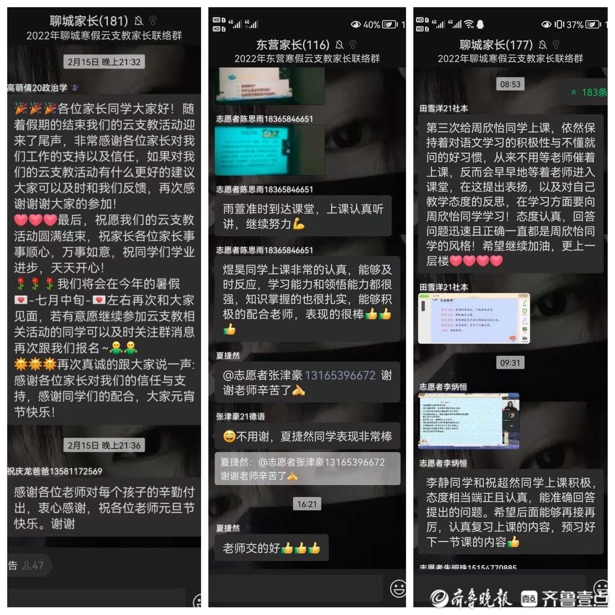 大学生志愿者叶雪梅深有感触地说,“我感觉到很欣慰,有一种被需要的感觉。感谢小朋友和家长的认可,如果有机会,还会再次参加爱心支教公益活动。”支教过程中,家长们积极与志愿者联系,充分肯定了志愿者们的无私付出,家长刘新针感激地说:“是志愿者无私付出让孩子们收获了知识,过了一个充实的寒假,希望志愿者们在今后的学习生活中健康快乐、学业顺利、学业有成!”