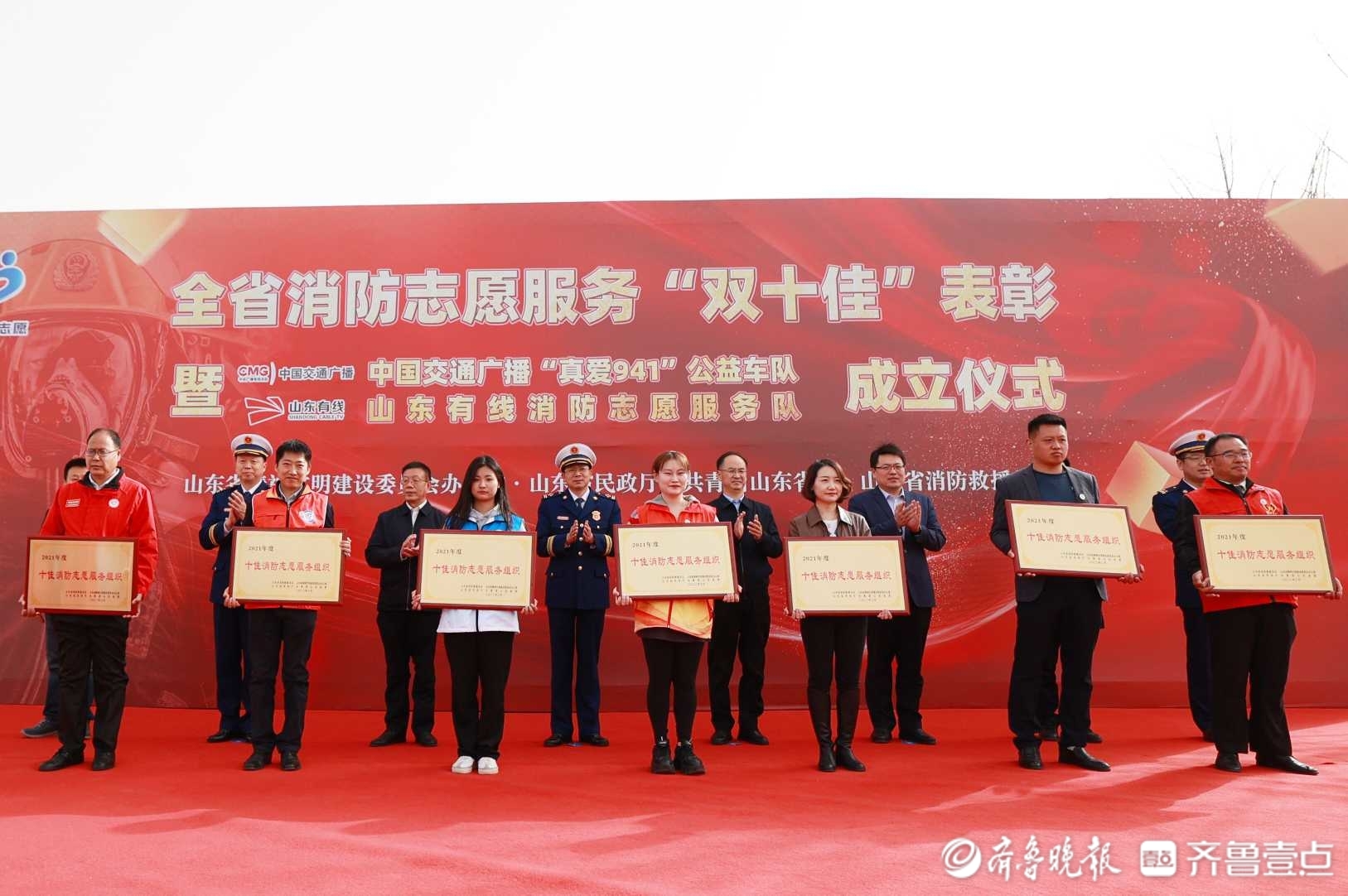 仪式上,与会领导为2021年度“十佳消防志愿服务组织”和“十佳消防志愿者”颁奖,并为“真爱941公益车队”“山东有线消防志愿服务队”两支省级消防志愿服务队授旗。随后,仪式同步启动了“志愿红 火焰蓝 携手护平安”消防志愿主题活动。