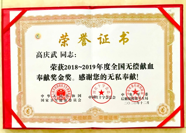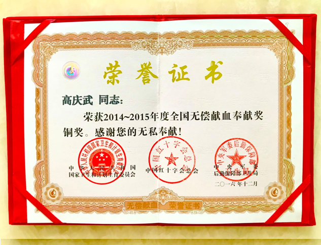 至今,总计献血76次,全血3100毫升,成分血129治疗量,也获得了国家金奖2次铜奖1次。
