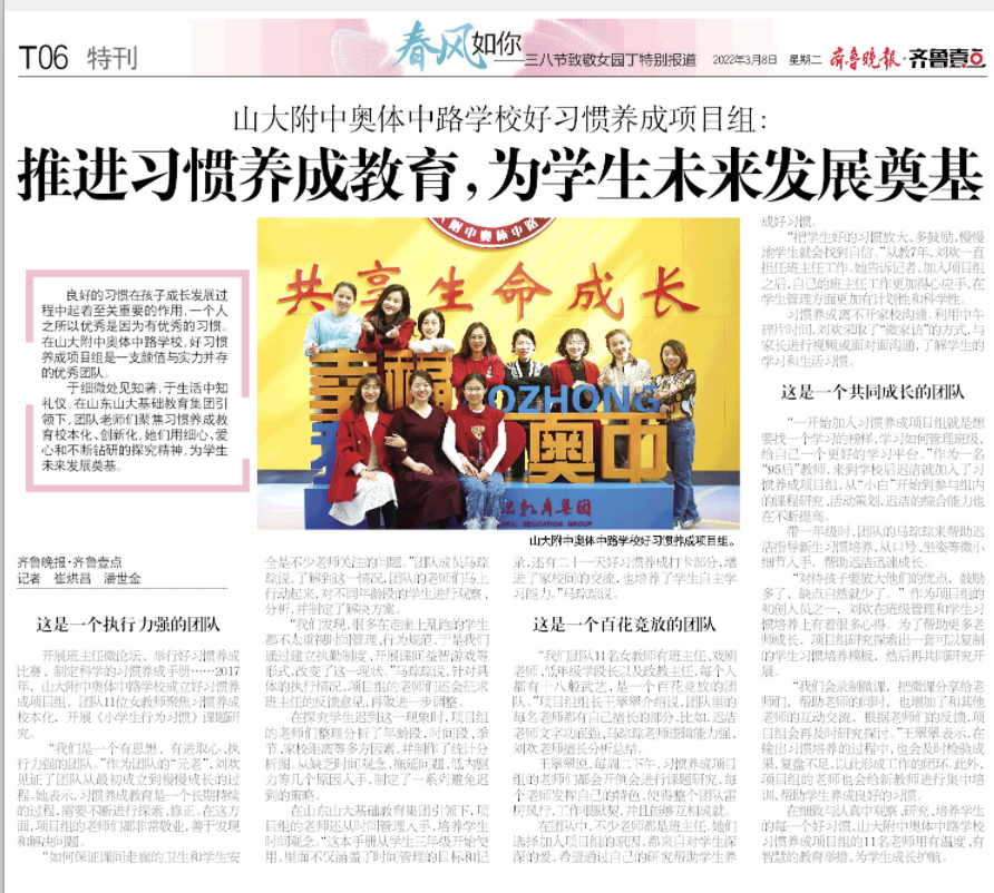 在细致与认真中观察、研究、培养学生的每一个好习惯,山大附中奥体中路学校习惯养成项目组的11名老师用有温度、有智慧的教育举措,为学生成长护航。