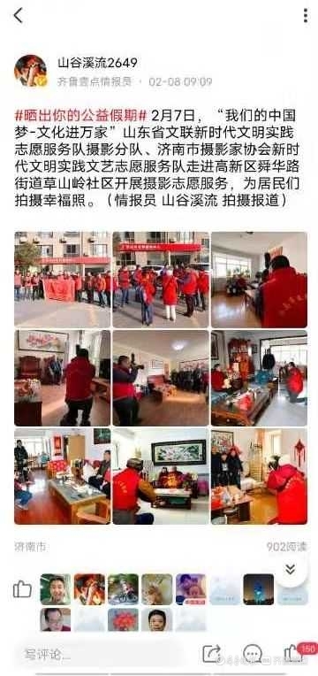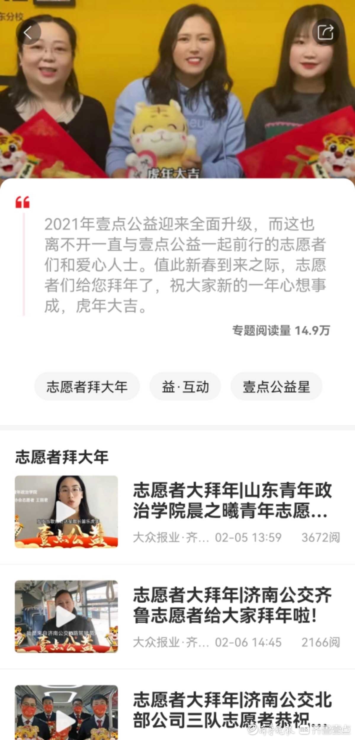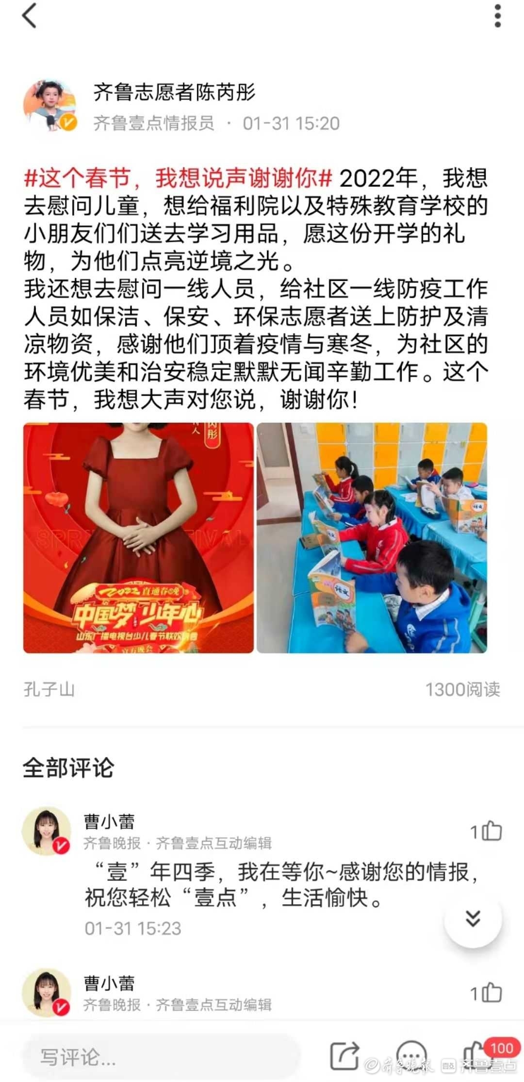 两个公益话题,4.9万阅读量。话题发布后,受到了大家的广泛关注,壹粉们积极参与互动,纷纷留言分享生活中的正能量。在话题互动中,齐鲁志愿者闫紫涵分享了她在假期里走进敬老院,为老人送去精彩演出的故事;齐鲁壹点情报员“山谷溪流2649”晒出了他走进济南高新区舜华路街道草山岭社区,为居民们拍摄幸福照的公益假期;齐鲁壹点情报员“仁合向”带来精彩演出的西关高跷队,道了一声感谢;齐鲁志愿者陈芮彤对顶着疫情与寒冬辛勤工作的社区工作者表达了深深地敬意。