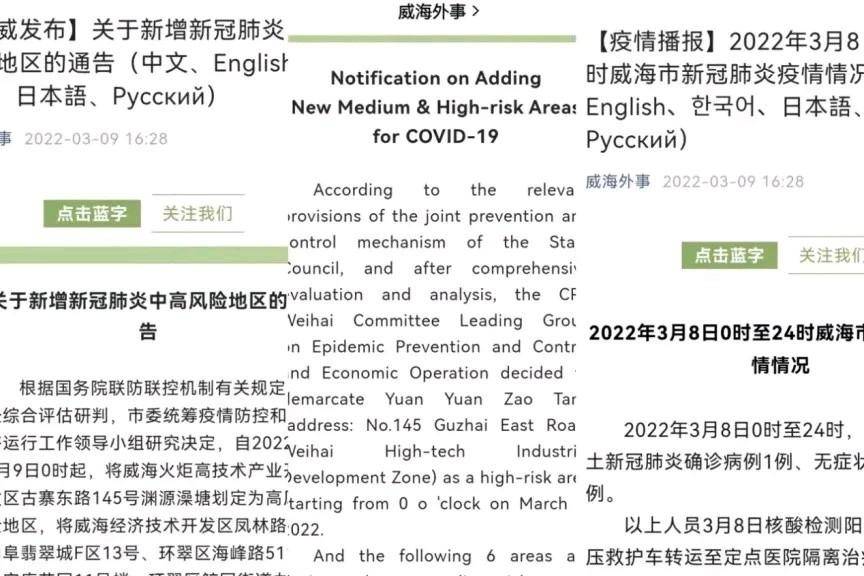 坚决扛牢涉外防控重任。3月9日上午,安排专人赴机场值守维护入境旅客防疫秩序,避免给我市疫情防控工作再添压力。在市指挥部的大力支持下,由市外办牵头的疫情防控工作外事组与市公安局、交通局、各区(市)指挥部密切配合,通力协作,确保有关旅客及时搭乘国际航班,相关航空公司代表旅客对我市所做的周到安排表示感谢。积极发挥语言优势,发出多语种《致在威外籍人士的公开信》,呼吁外籍人士积极响应市委、市政府的号召,切实配合做好疫情防控工作,并第一时间将我市新增新冠肺炎中高风险地区的通告、当日最新疫情等信息翻译成英、韩、日、俄等4种语言,在“威海外事”公众号统一发布,方便外籍人士及时了解权威信息。