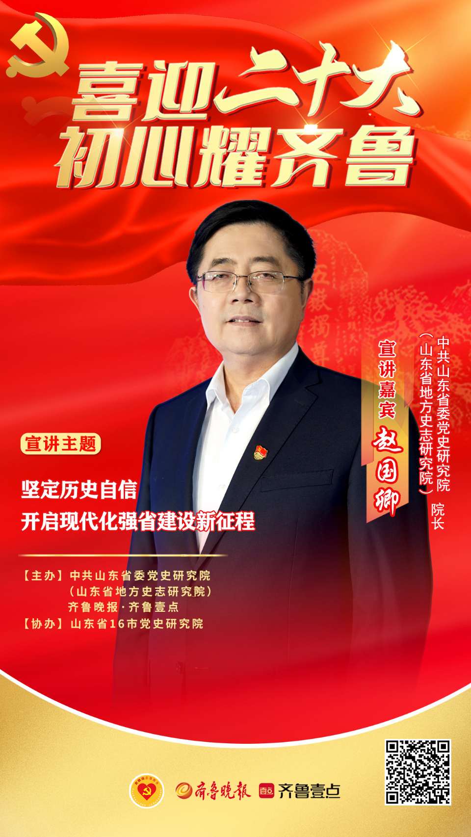 喜迎二十大·初心耀齐鲁!中共山东省委党史研究院(山东省地方史志研究院)与齐鲁晚报·齐鲁壹点联合主办,山东16市党史研究院协办,共同推出““喜迎二十大·初心耀齐鲁——山东省党史史志系统党史宣讲大型融媒策划”。开讲嘉宾为中共山东省委党史研究院(山东省地方史志研究院)院长赵国卿,宣讲主题为《坚定历史自信 开启现代化强省建设新征程》。