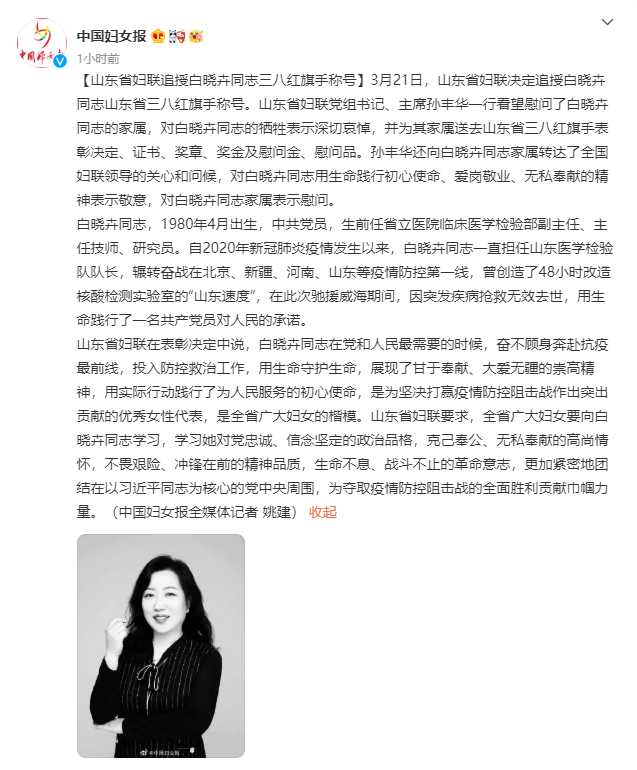 白晓卉同志,1980年4月出生,中共党员,生前任省立医院临床医学检验部副主任、主任技师、研究员。自2020年新冠肺炎疫情发生以来,白晓卉同志一直担任山东医学检验队队长,辗转奋战在北京、新疆、河南、山东等疫情防控第一线,曾创造了48小时改造核酸检测实验室的“山东速度”,在此次驰援威海期间,因突发疾病抢救无效去世,用生命践行了一名共产党员对人民的承诺。