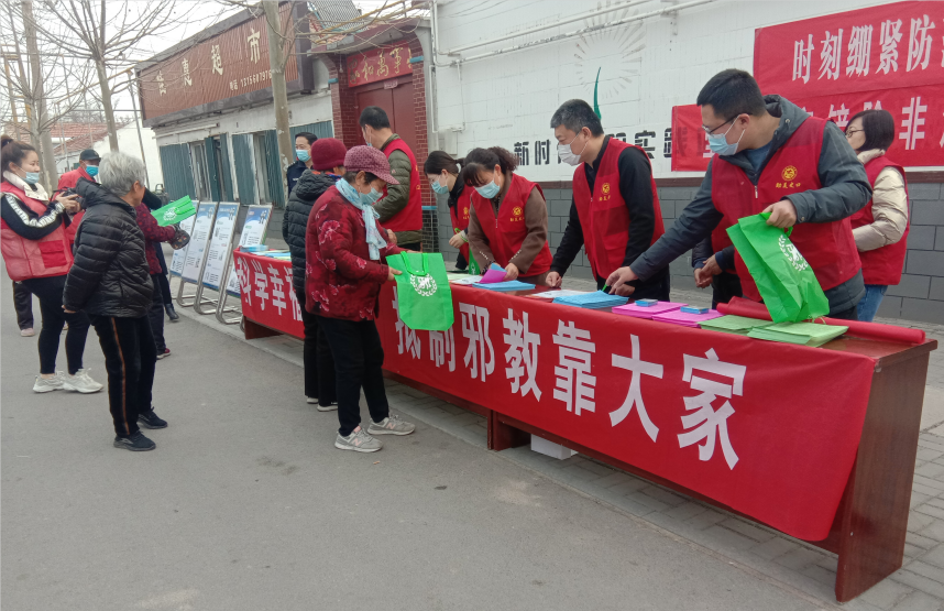 镇综治中心工作人员与新时代文明实践志愿者、警务人员、网格员等联合组建防邪反邪宣传队,在油郭大集开展反邪教宣传活动,发放《崇尚科学、反对邪教》明白纸2000余份、有反邪教警示标语的手提袋500余个、有反邪教知识的扑克200余盒、悬挂横幅3幅、现场解答群众疑问20余次,向群众普及关于反邪教的系列知识,警示广大群众提高警惕,号召广大群众做崇尚科学、反对邪教的明白人,做健康快乐美好生活的引领人,做幸福家庭美丽家园的守护人。