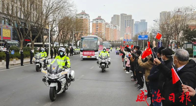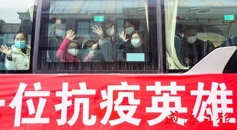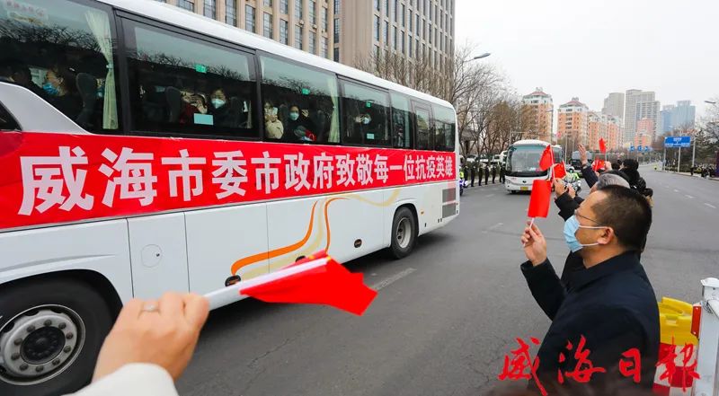随后,各援威医疗队员登上大巴,缓缓驶离驻地。孙继业、张海波、闫剑波等满怀深情地向大家挥手告别,目送英雄离开。奋战在一线的基层干部和志愿者们主动走上街头欢送英雄返程;公安干警列队敬礼,以警车开道的最高礼遇为他们送行;沿街社区里,居家群众纷纷从窗户上挥手致意,与逆行者道别,“威海加油”“威海必胜”的声音久久回荡。