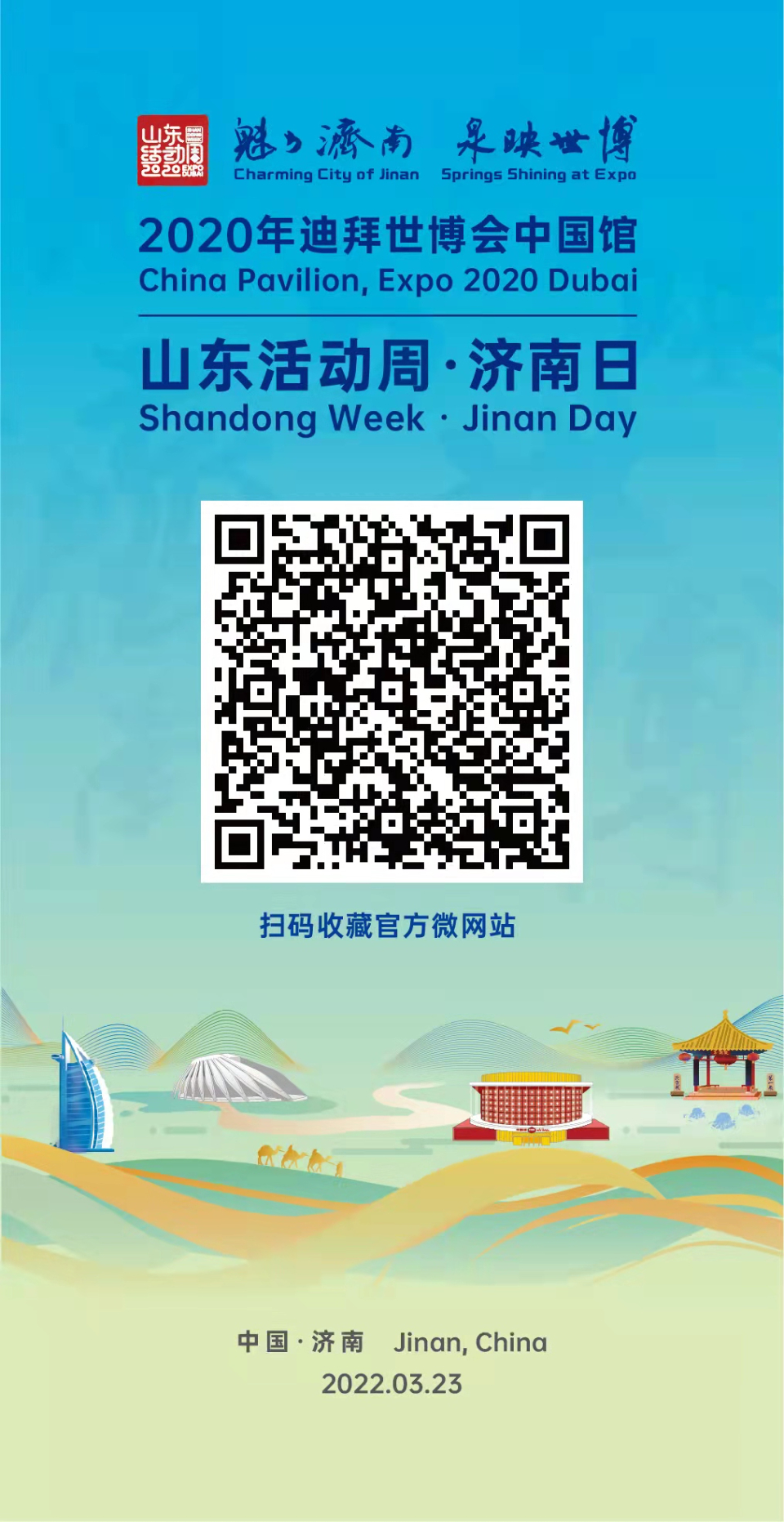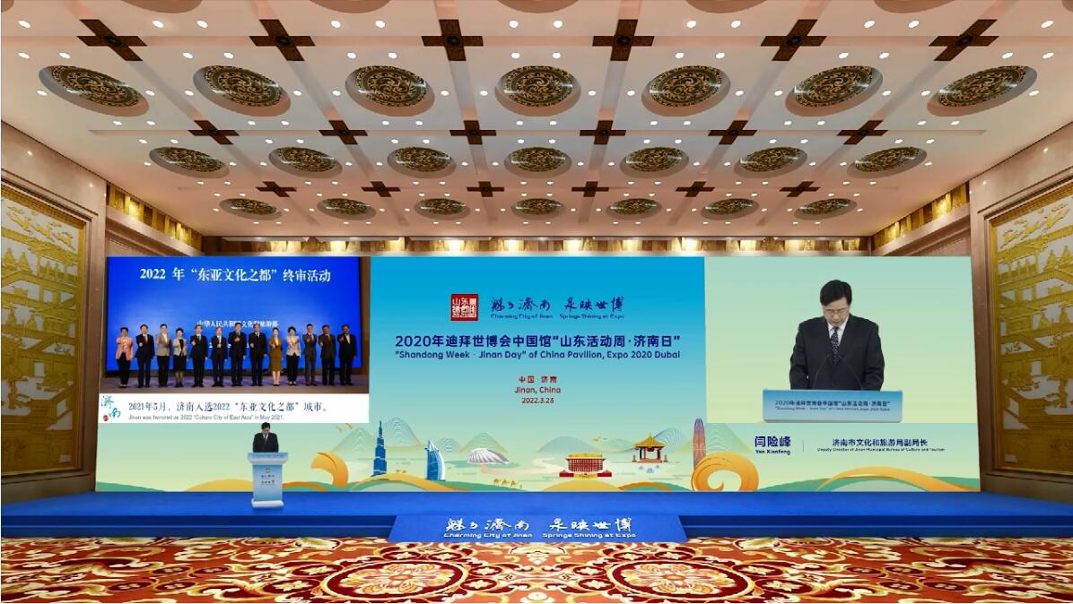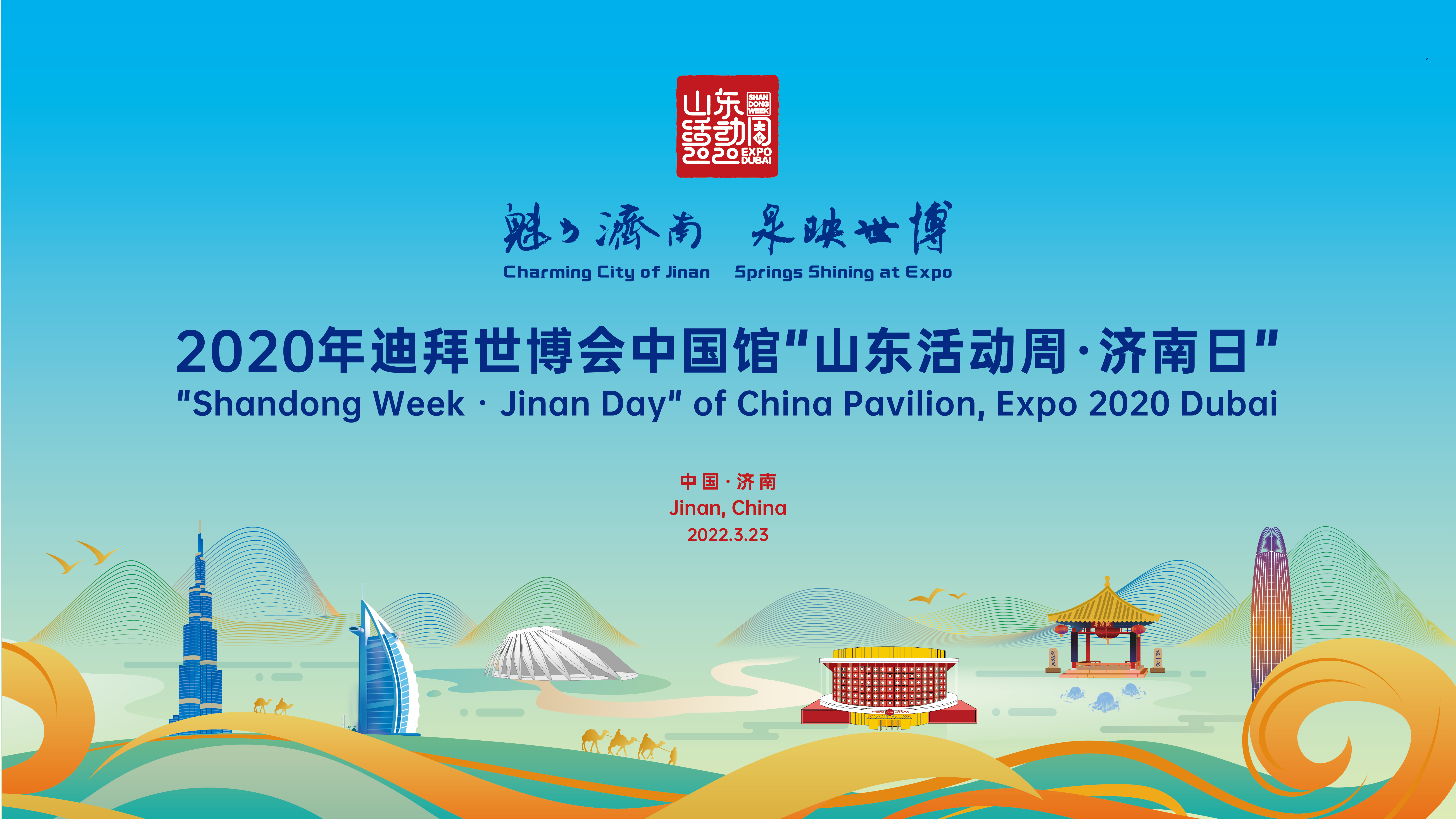 中国馆“山东活动周•济南日”活动于2022年3月23日下午14时30分正式开幕,围绕“魅力济南,泉映世博”主题,在迪拜与济南之间加起一座时空之桥。