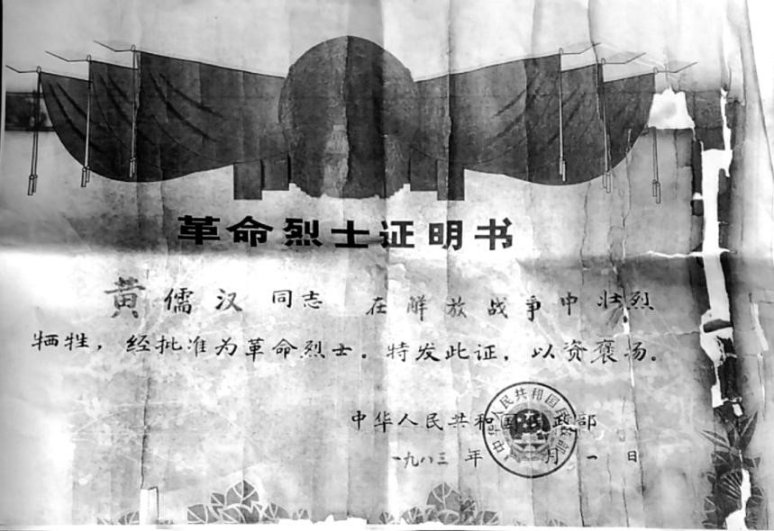 黄儒汉烈士证明书