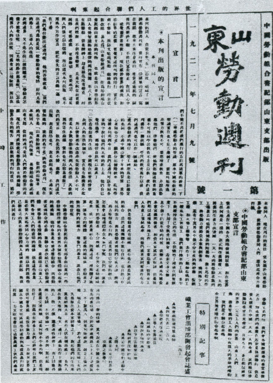 王尽美在《山东劳动周刊》第一号第一版发表的《矿业工会淄博部开发起会志盛》一文,盛赞淄博第一个工会组织的建立。